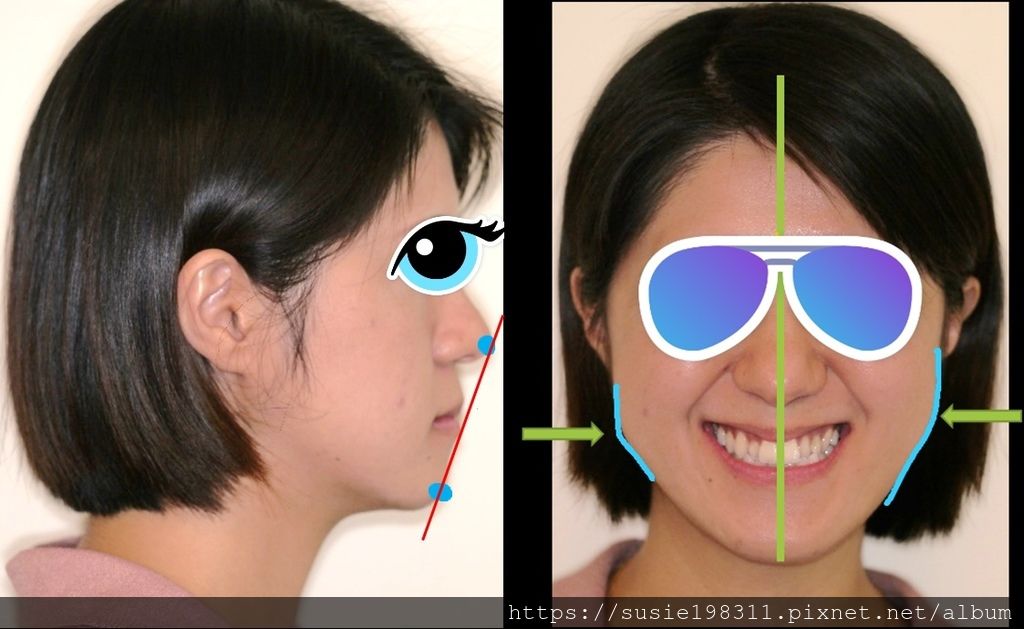 就圖片來看,醫師很細心的畫出示意圖,告訴我我的臉型以側面(左圖)來看,算是目前大眾覺得不錯的臉型角度,從鼻子到下巴呈45度的直線。