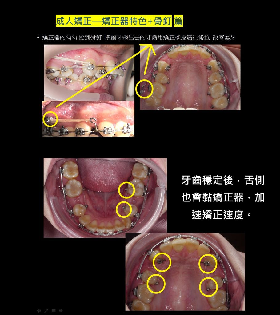 像我的狀況,就因為齒列不整的擠壓,造成臉型不平均與微微戽斗的狀況,所以醫師特別說明,如果有需要會像圖片處這樣打下骨釘,利用骨釘與橡皮筋的拉力將牙齒拉回正常的位置,改善齒列,也會在牙齒穩定後,於舌側牙齒黏上矯正器,更可以加快矯正的速度,大家最擔憂的戴牙套總是要戴很久的困擾有明燈了