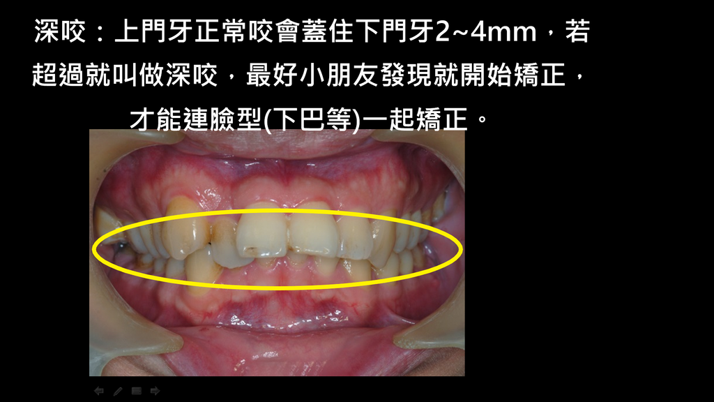 如圖的狀況就是很明顯的深咬,簡單說就是上門牙正常咬合時會蓋處下門牙大半,長久以來會嚴重影響臉型與下巴,最好是小朋友發現時就要趕快矯正喔!